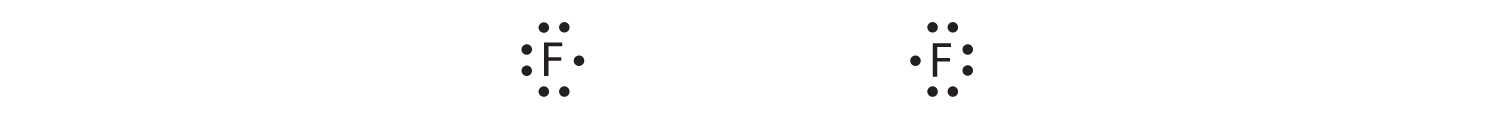Fluorine is another element whose atoms bond together in pairs to form diatomic (two-atom) molecules. Two separate fluorine atoms have the following electron dot diagrams:
