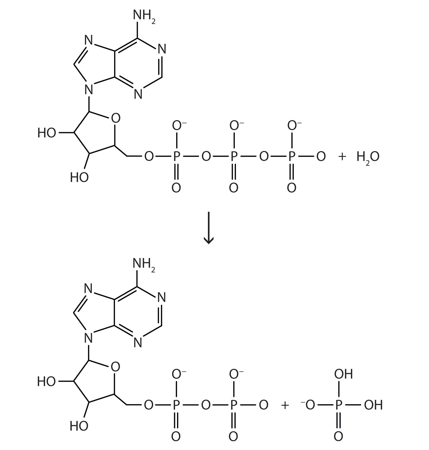Another important reaction is the conversion of adenosine triphosphate (ATP) to adenosine diphosphate (ADP), which is shown in Figure 7.5 "ATP to ADP". Under physiological conditions, the breaking of an O–P bond and the formation of an O–P and two O–H bonds gives off about 7.5 kcal/mol of ATP. This may not seem like much energy, especially compared to the amount of energy given off when glucose reacts. It is enough energy, however, to fuel other biochemically important chemical reactions in our cells.