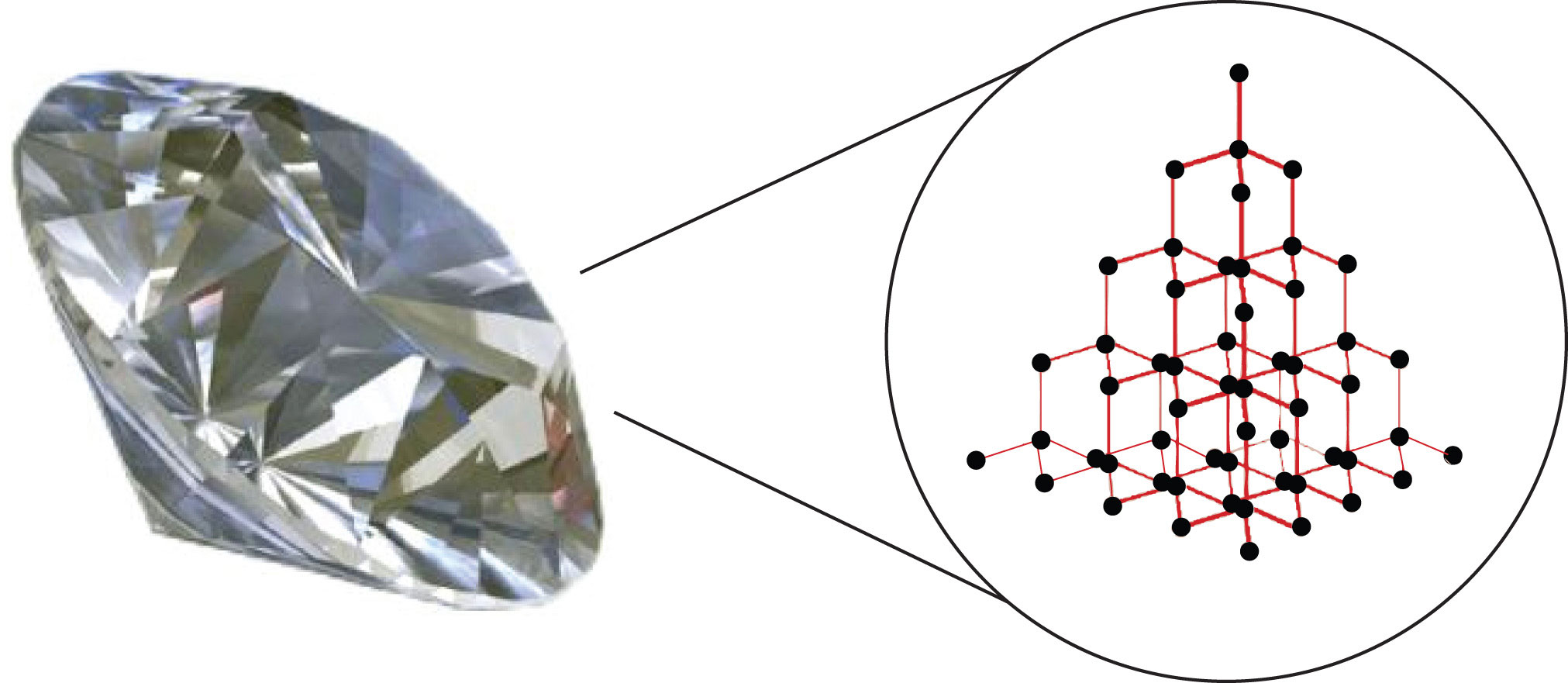 Substances with the highest melting and boiling points have covalent network bondingA type of interaction in which all the atoms in a sample are covalently bonded to other atoms.. This type of intermolecular interaction is actually a covalent bond. (For more information about covalent bonding, see Chapter 4 "Covalent Bonding and Simple Molecular Compounds".) In these substances, all the atoms in a sample are covalently bonded to other atoms; in effect, the entire sample is essentially one large molecule. Many of these substances are solid over a large temperature range because it takes a lot of energy to disrupt all the covalent bonds at once. One example of a substance that shows covalent network bonding is diamond (Figure 8.2 "Diamond"), which is a form of pure carbon. At temperatures over 3,500°C, diamond finally vaporizes into gas-phase atoms.