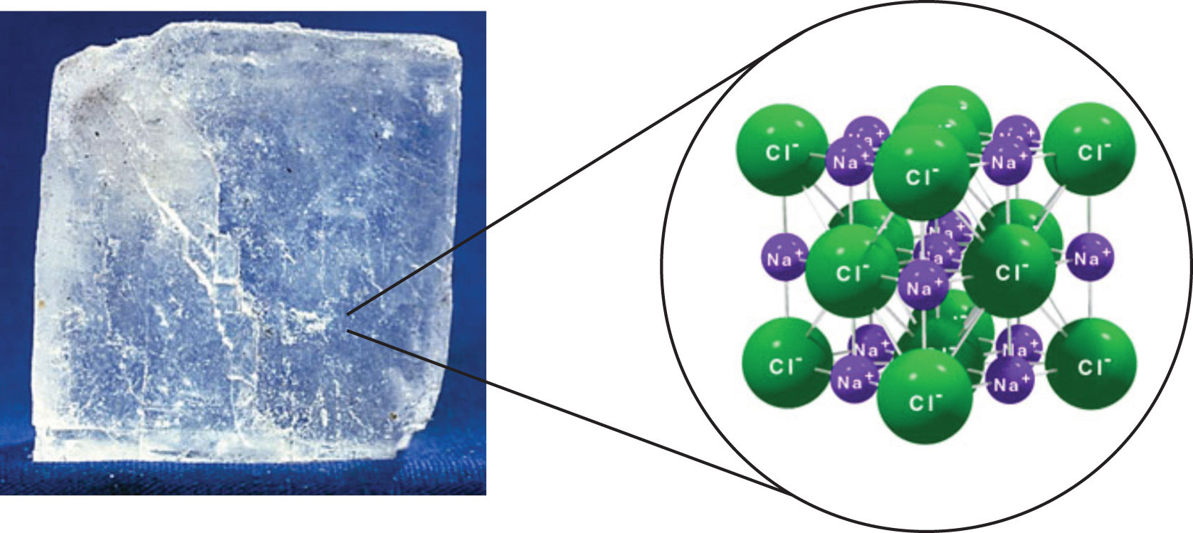 The strongest force between any two particles is the ionic bond, in which two ions of opposing charge are attracted to each other. (For more information about ionic bonding, see Chapter 3 "Ionic Bonding and Simple Ionic Compounds".) Thus, ionic interactionsAn attraction due to ions of opposite charges. between particles are another type of intermolecular interaction. Substances that contain ionic interactions are relatively strongly held together, so these substances typically have high melting and boiling points. Sodium chloride (Figure 8.3 "Sodium Chloride") is an example of a substance whose particles experience ionic interactions (Table 8.1 "Temperature Ranges for the Three Phases of Various Substances").