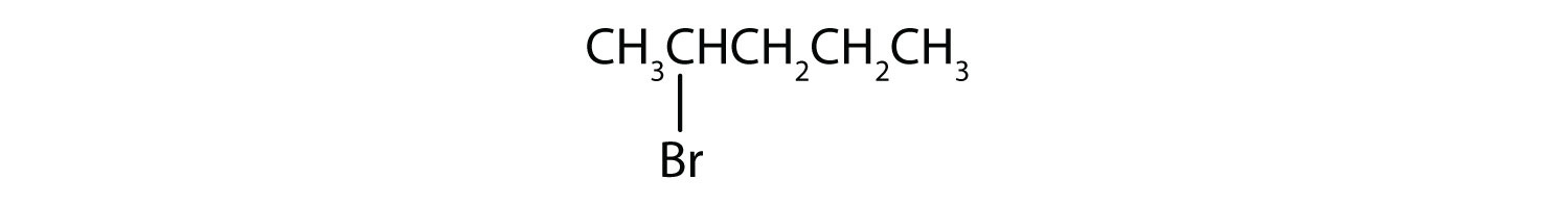 The replacement of only one hydrogen atom gives an alkyl halide (or haloalkane)A compound resulting from the replacement of a hydrogen atom of an alkane with a halogen atom.. The common names of alkyl halides consist of two parts: the name of the alkyl group plus the stem of the name of the halogen, with the ending -ide. The IUPAC system uses the name of the parent alkane with a prefix indicating the halogen substituents, preceded by number indicating the substituent’s location. The prefixes are fluoro-, chloro-, bromo-, and iodo-. Thus CH3CH2Cl has the common name ethyl chloride and the IUPAC name chloroethane. Alkyl halides with simple alkyl groups (one to four carbon atoms) are often called by common names. Those with a larger number of carbon atoms are usually given IUPAC names.
