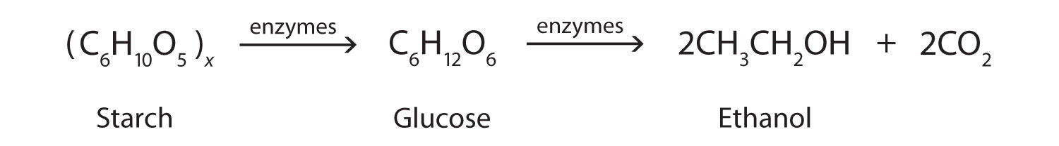 In addition to its preparation from ethylene, ethanol is made by the fermentation of sugars or starch from various sources (potatoes, corn, wheat, rice, etc.). Fermentation is catalyzed by enzymes found in yeast and proceeds by an elaborate multistep mechanism. We can represent the overall process as follows: