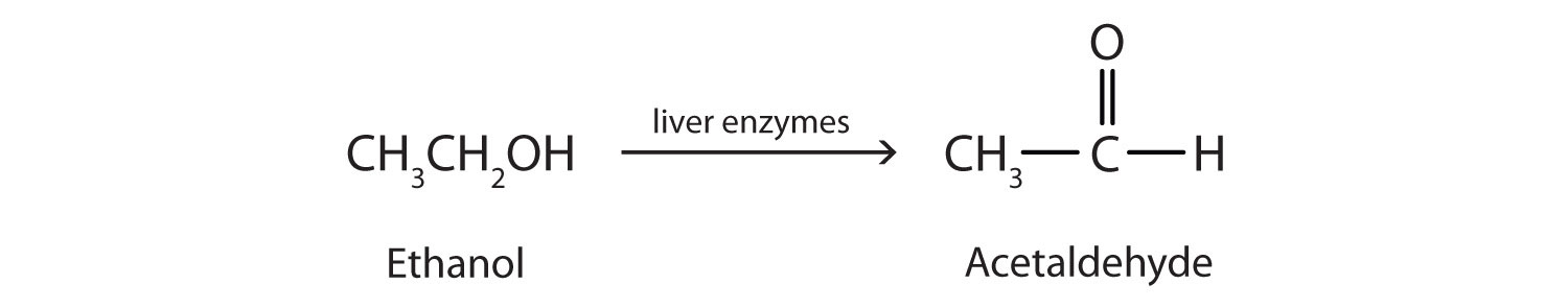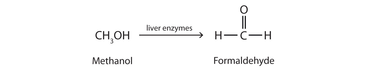 Methanol is quite poisonous to humans. Ingestion of as little as 15 mL of methanol can cause blindness, and 30 mL (1 oz) can cause death. However, the usual fatal dose is 100 to 150 mL. The main reason for methanol’s toxicity is that we have liver enzymes that catalyze its oxidation to formaldehyde, the simplest member of the aldehyde family (Section 14.9 "Aldehydes and Ketones: Structure and Names"):