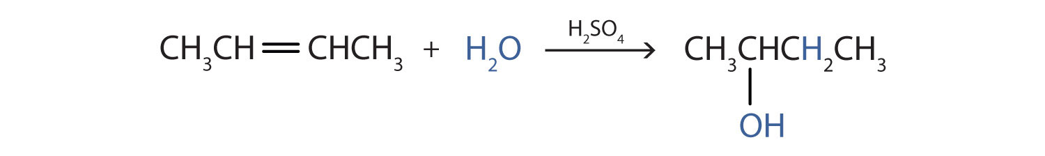Write the equation for the reaction of 2-butene with water to form 2-butanol. Indicate that sulfuric acid is used as a catalyst.