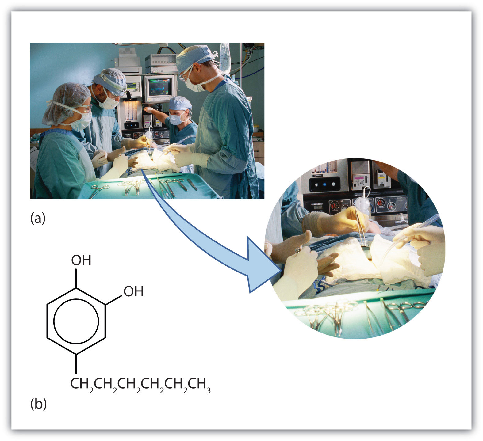 (a) Phenolic compounds help to ensure antiseptic conditions in hospital operating rooms. (b) The compound 4-hexylresorcinol is mild enough to be used as the active ingredient in antiseptic preparations for use on the skin.