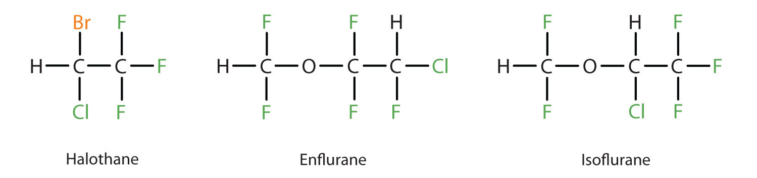 Diethyl ether is relatively safe because there is a fairly wide gap between the dose that produces an effective level of anesthesia and the lethal dose. However, because it is highly flammable and has the added disadvantage of causing nausea, it has been replaced by newer inhalant anesthetics, including the fluorine-containing compounds halothane, enflurane, and isoflurane. Unfortunately, the safety of these compounds for operating room personnel has been questioned. For example, female operating room workers exposed to halothane suffer a higher rate of miscarriages than women in the general population.