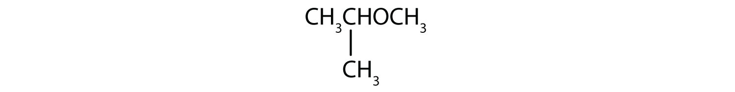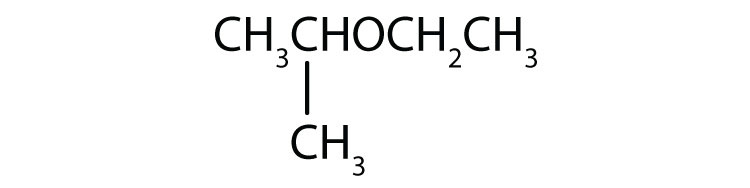 Ether molecules have no hydrogen atom on the oxygen atom (that is, no OH group). Therefore there is no intermolecular hydrogen bonding between ether molecules, and ethers therefore have quite low boiling points for a given molar mass. Indeed, ethers have boiling points about the same as those of alkanes of comparable molar mass and much lower than those of the corresponding alcohols (Table 14.4 "Comparison of Boiling Points of Alkanes, Alcohols, and Ethers").
