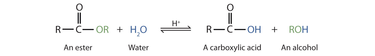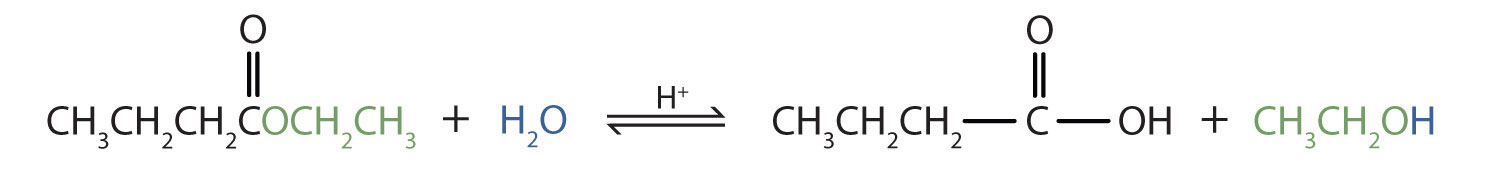 Esters are neutral compounds, unlike the acids from which they are formed. In typical reactions, the alkoxy (OR′) group of an ester is replaced by another group. One such reaction is hydrolysisThe reaction of a substance with water., literally “splitting with water.” The hydrolysis of esters is catalyzed by either an acid or a base.