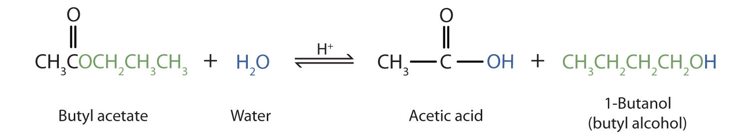 As a specific example, butyl acetate and water react to form acetic acid and 1-butanol. The reaction is reversible and does not go to completion.