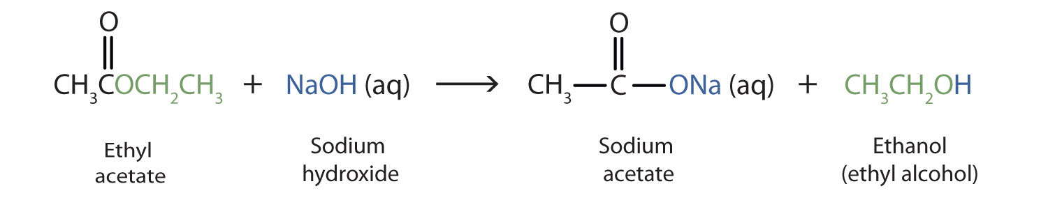 As a specific example, ethyl acetate and NaOH react to form sodium acetate and ethanol: