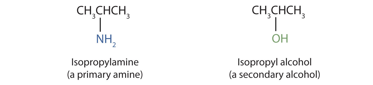 To classify alcohols, we look at the number of carbon atoms bonded to the carbon atom bearing the OH group, not the oxygen atom itself. Thus, although isopropylamine looks similar to isopropyl alcohol, the former is a primary amine, while the latter is a secondary alcohol.