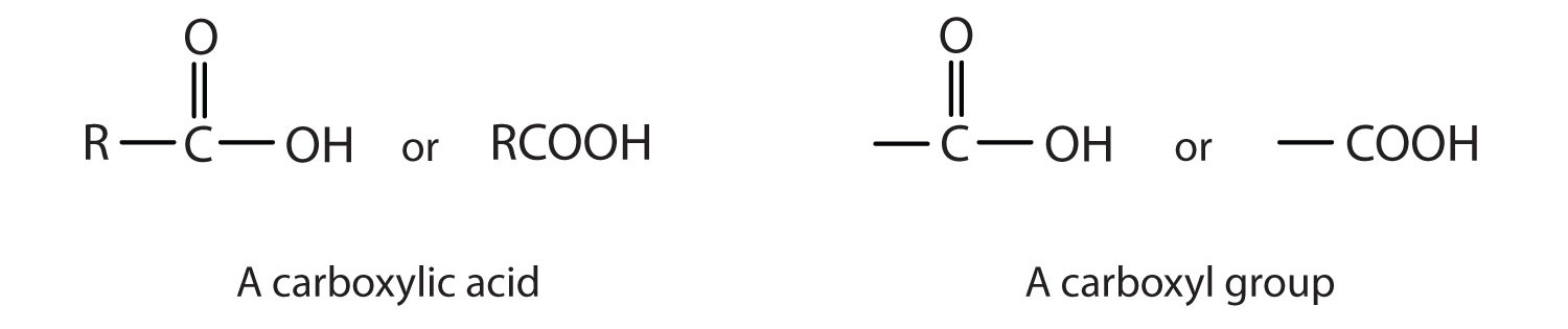 A carboxylic acidAn organic compound that has a carboxyl group. is an organic compound that has a carboxyl groupA functional group that contains a carbon–oxygen bond and an OH group also attached to the same carbon atom.. The carboxyl group is a functional group that contains a carbon–oxygen double bond and an OH group also attached to the same carbon atom, but it has characteristic properties of its own. As with aldehydes and ketones, carboxylic acid formulas can be written to show the carbon-to-oxygen double bond explicitly, or the carboxyl group can be written in condensed form on one line. In general, carboxylic acids are represented by the formula RCOOH, where R is a hydrocarbon group.