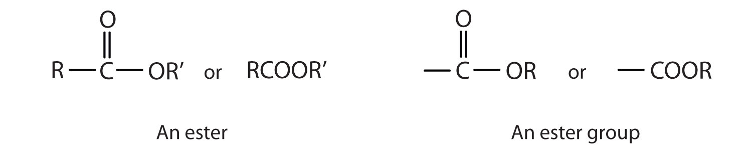 Esters are represented by the formula RCOOR’, where R and R’ are hydrocarbon groups. The esterAn organic compound derived from a carboxylic acid and an alcohol in which the OH of the acid is replaced by an OR group., which is organic compound derived from a carboxylic acid and an alcohol in which the OH of the acid is replaced by an OR group, looks somewhat like an ether and also somewhat like a carboxylic acid. Even so, compounds in this group react neither like carboxylic acids nor like ethers; they make up a distinctive family. Unlike ethers, esters have a carbonyl group. Unlike carboxylic acids, esters have no acidic hydrogen atom; they have a hydrocarbon group in its place.