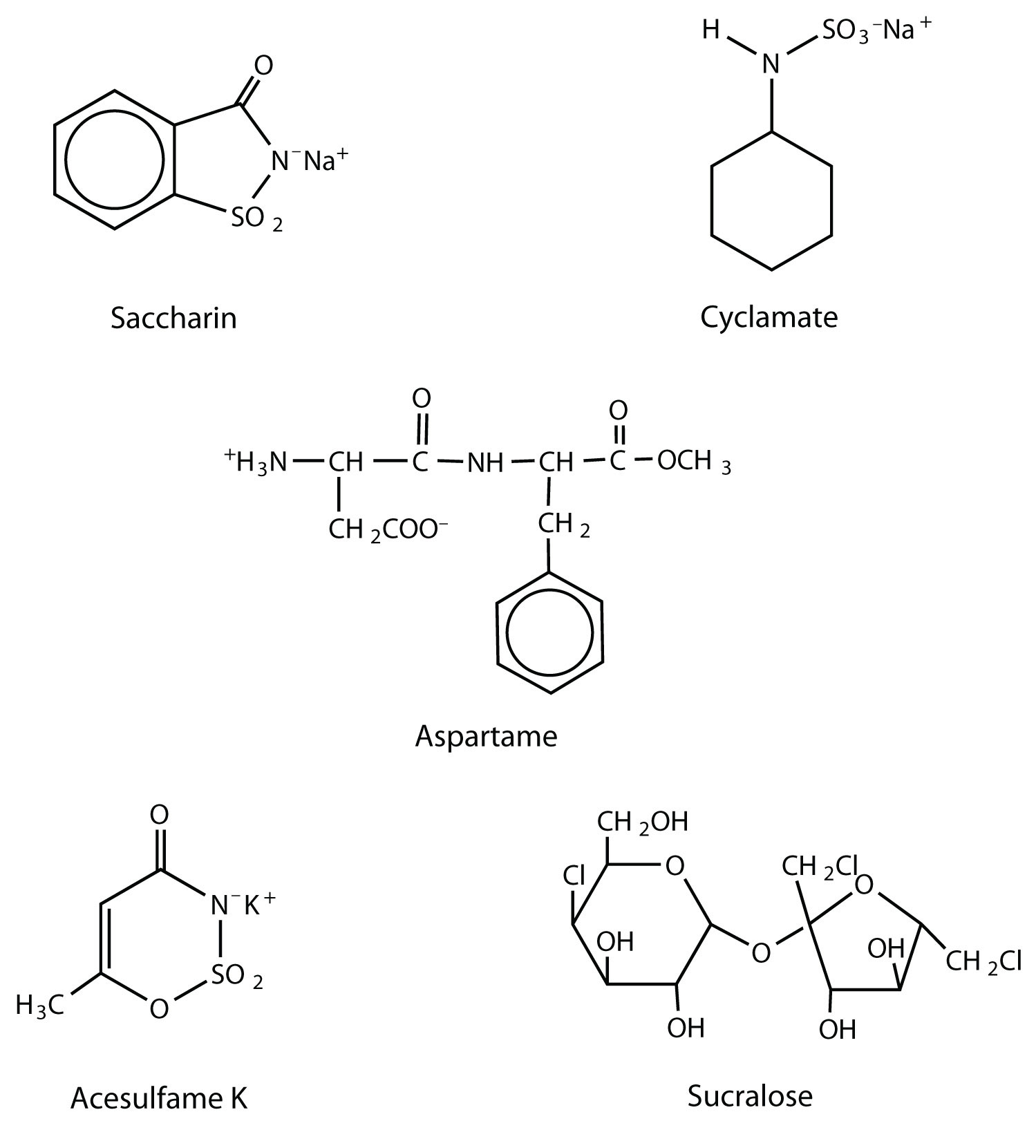 The first artificial sweetener—saccharin—was discovered by accident in 1879. It is 300 times sweeter than sucrose, but it passes through the body unchanged and thus adds no calories to the diet. After its discovery, saccharin was used until it was banned in the early 1900s. However, during the sugar-short years of World War I, the ban was lifted and was not reinstated at the war’s end. One drawback to the use of saccharin is its bitter, metallic aftertaste. The initial solution to this problem was to combine saccharin with cyclamate, a second artificial sweetener discovered in 1937.