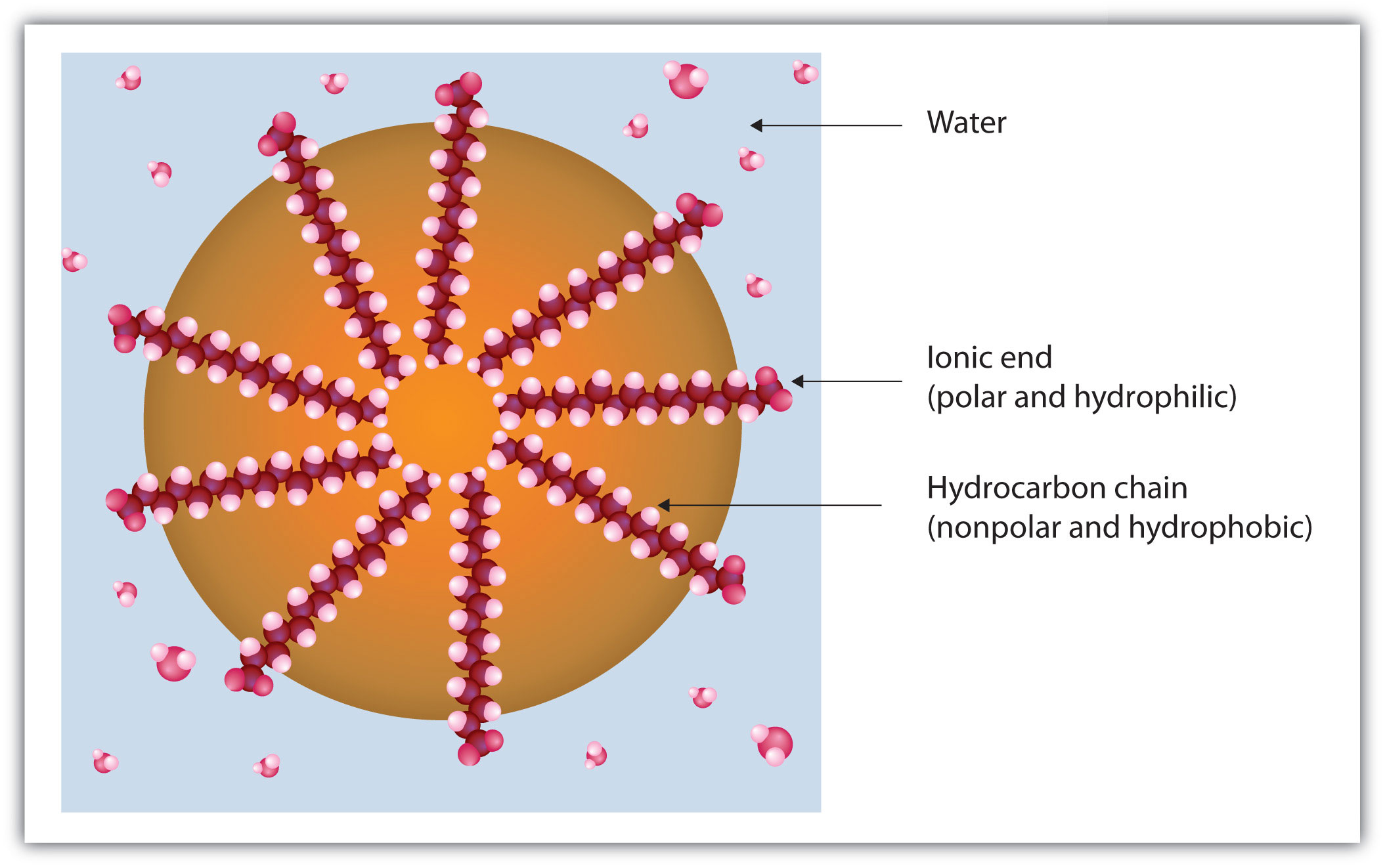 Dirt and grime usually adhere to skin, clothing, and other surfaces by combining with body oils, cooking fats, lubricating greases, and similar substances that act like glues. Because these substances are not miscible in water, washing with water alone does little to remove them. Soap removes them, however, because soap molecules have a dual nature. One end, called the head, carries an ionic charge (a carboxylate anion) and therefore dissolves in water; the other end, the tail, has a hydrocarbon structure and dissolves in oils. The hydrocarbon tails dissolve in the soil; the ionic heads remain in the aqueous phase, and the soap breaks the oil into tiny soap-enclosed droplets called micelles, which disperse throughout the solution. (For more information about cell structure, see Section 17.3 "Membranes and Membrane Lipids".) The droplets repel each other because of their charged surfaces and do not coalesce. With the oil no longer “gluing” the dirt to the soiled surface (skin, cloth, dish), the soap-enclosed dirt can easily be rinsed away.