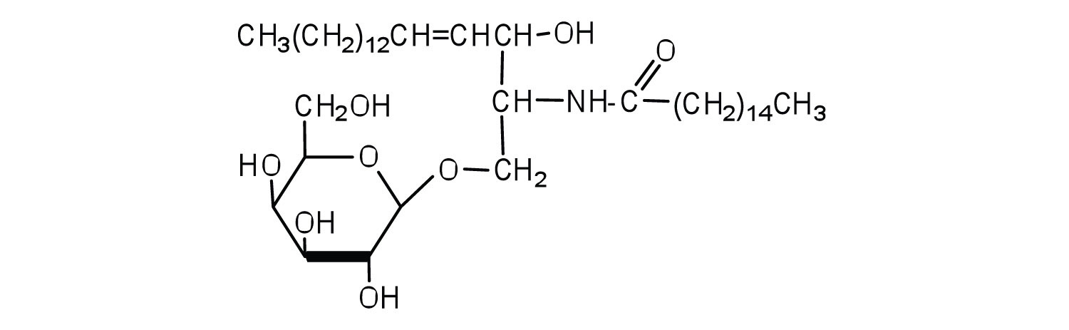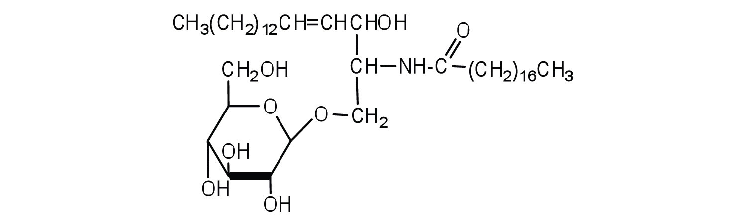 Most animal cells contain sphingolipids called cerebrosidesA sphingolipid that contains a fatty acid unit, a sphingosine unit, and galactose or glucose. (Figure 17.10 "Cerebrosides"). Cerebrosides are composed of sphingosine, a fatty acid, and galactose or glucose. They therefore resemble sphingomyelins but have a sugar unit in place of the choline phosphate group. Cerebrosides are important constituents of the membranes of nerve and brain cells.