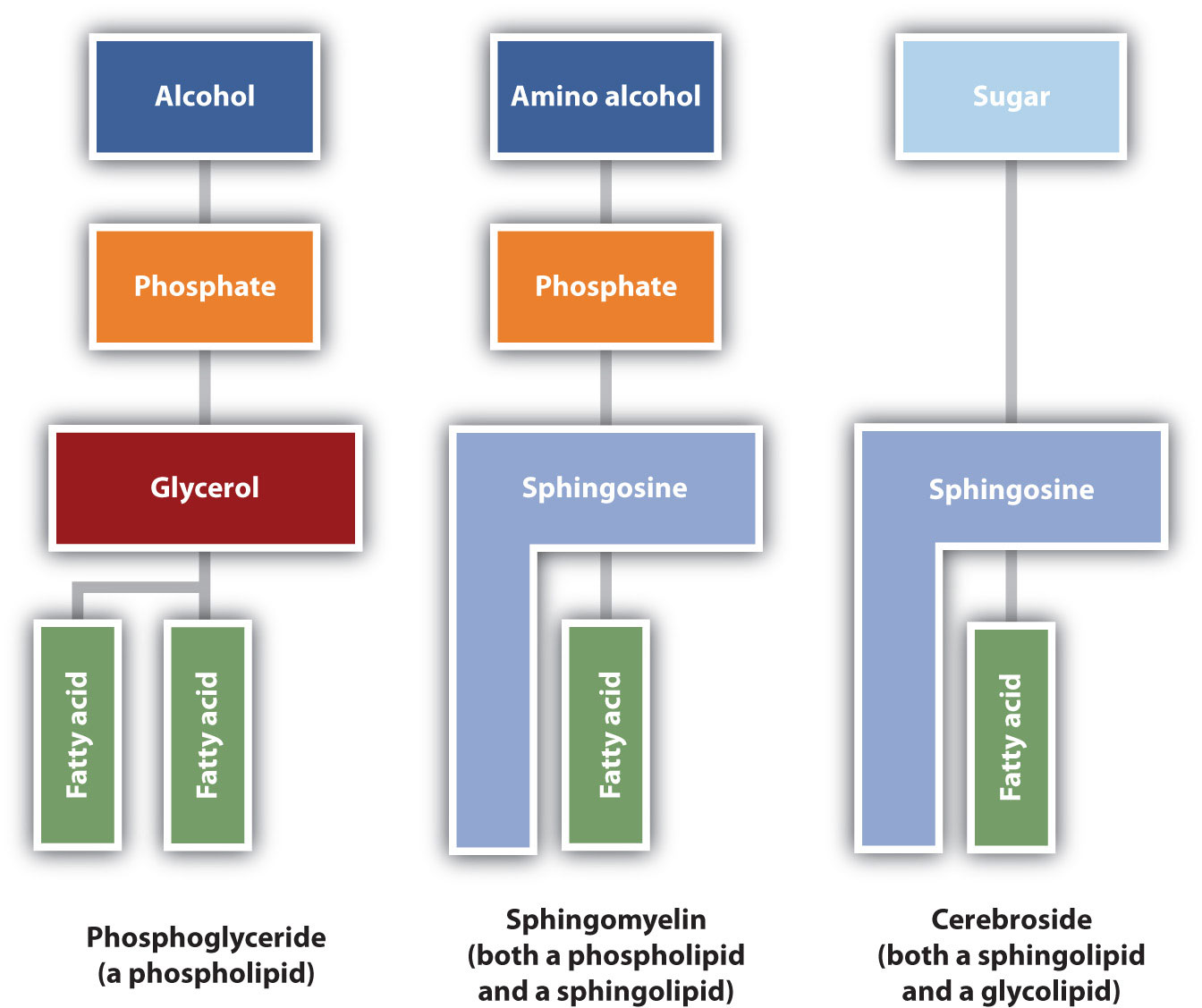 The lipids found in cell membranes can be categorized in various ways. PhospholipidsA lipid containing phosphorus. are lipids containing phosphorus. GlycolipidsA sugar-containing lipid. are sugar-containing lipids. The latter are found exclusively on the outer surface of the cell membrane, acting as distinguishing surface markers for the cell and thus serving in cellular recognition and cell-to-cell communication. SphingolipidsA lipid that contains the unsaturated amino alcohol sphingosine. are phospholipids or glycolipids that contain the unsaturated amino alcohol sphingosine rather than glycerol. Diagrammatic structures of representative membrane lipids are presented in Figure 17.7 "Component Structures of Some Important Membrane Lipids".
