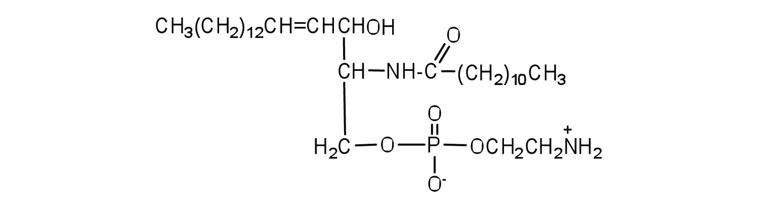 SphingomyelinsA sphingolipid that contains a fatty acid unit, a phosphoric acid unit, a sphingosine unit, and a choline unit., the simplest sphingolipids, each contain a fatty acid, a phosphoric acid, sphingosine, and choline (Figure 17.9 "Sphingolipids"). Because they contain phosphoric acid, they are also classified as phospholipids. Sphingomyelins are important constituents of the myelin sheath surrounding the axon of a nerve cell. Multiple sclerosis is one of several diseases resulting from damage to the myelin sheath.