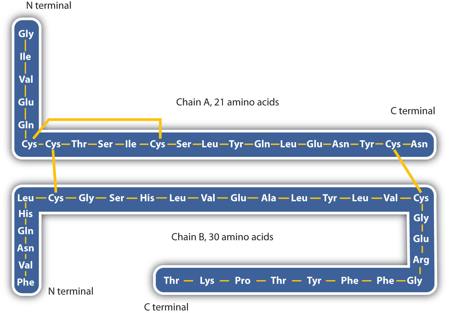 The structure of proteins is generally described as having four organizational levels. The first of these is the primary structureThe sequence of amino acids in a polypeptide chain or protein., which is the number and sequence of amino acids in a protein’s polypeptide chain or chains, beginning with the free amino group and maintained by the peptide bonds connecting each amino acid to the next. The primary structure of insulin, composed of 51 amino acids, is shown in Figure 18.2 "Primary Structure of Human Insulin".