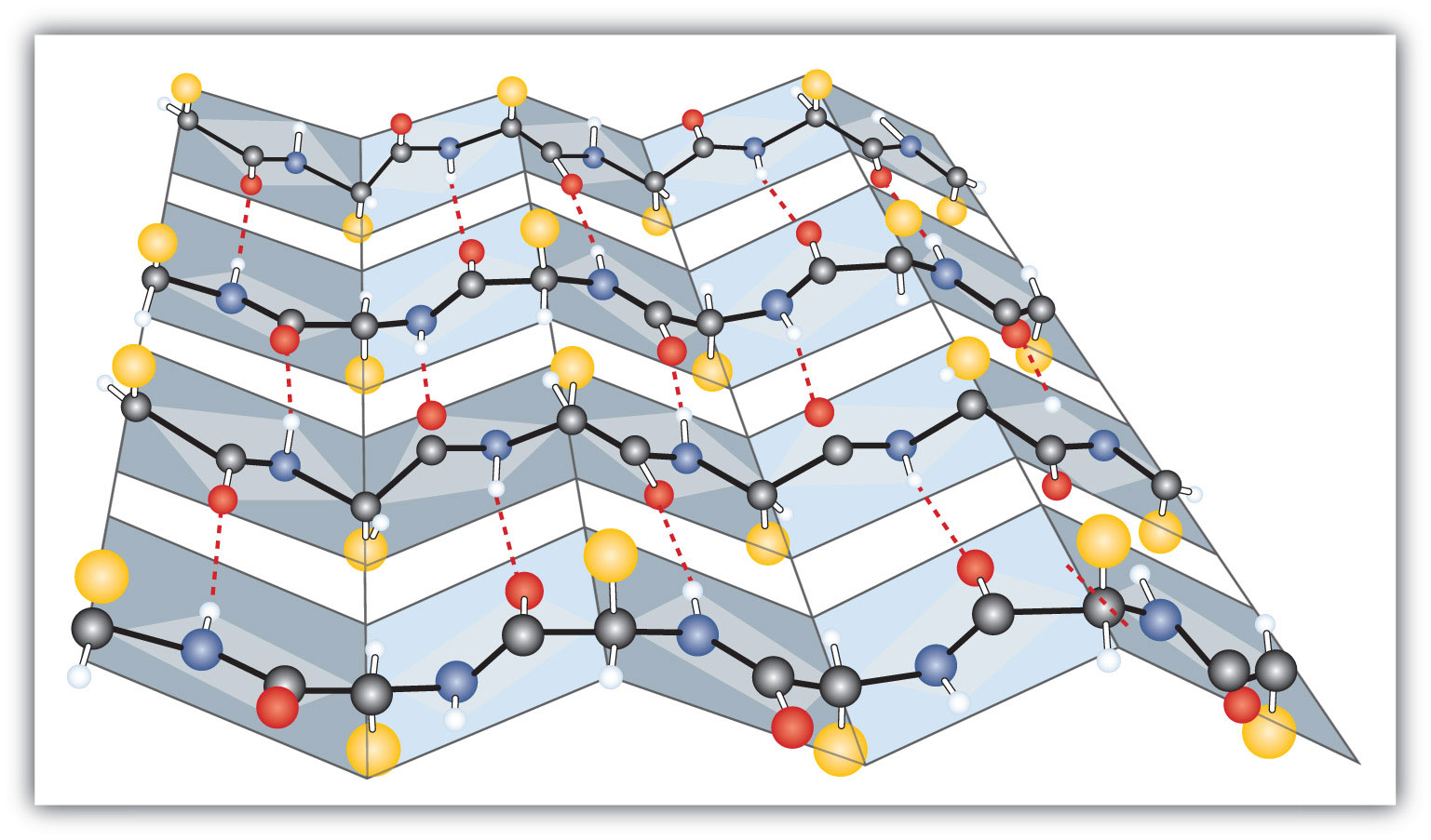 Another common type of secondary structure, called the β-pleated sheet conformation, is a sheetlike arrangement in which two or more extended polypeptide chains (or separate regions on the same chain) are aligned side by side. The aligned segments can run either parallel or antiparallel—that is, the N-terminals can face in the same direction on adjacent chains or in different directions—and are connected by interchain hydrogen bonding (Figure 18.4 "A Ball-and-Stick Model of the β-Pleated Sheet Structure in Proteins"). The β-pleated sheet is particularly important in structural proteins, such as silk fibroin. It is also seen in portions of many enzymes, such as carboxypeptidase A and lysozyme.