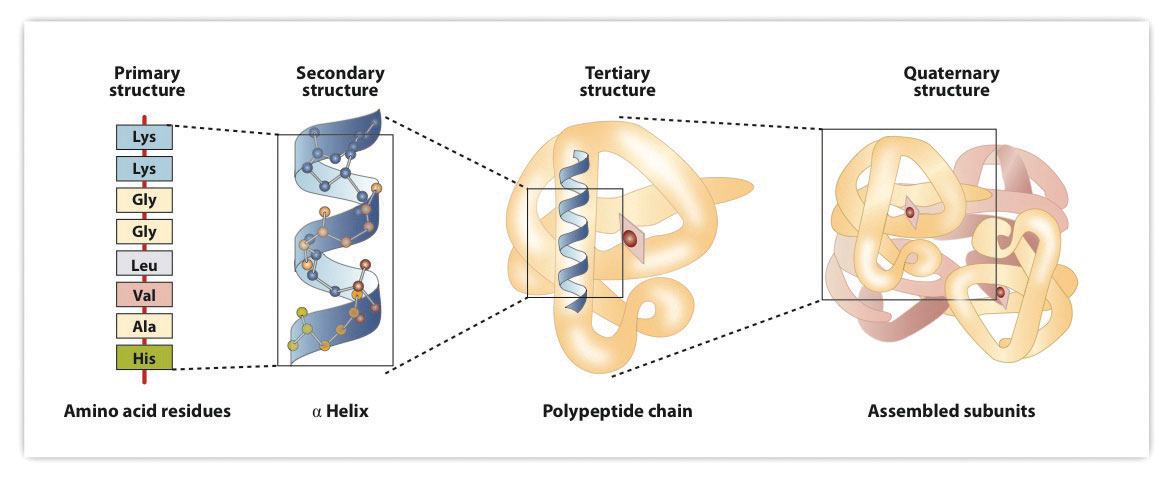 When a protein contains more than one polypeptide chain, each chain is called a subunit. The arrangement of multiple subunits represents a fourth level of structure, the quaternary structureThe arrangement of multiple subunits in a protein. of a protein. Hemoglobin, with four polypeptide chains or subunits, is the most frequently cited example of a protein having quaternary structure (Figure 18.7 "The Quaternary Structure of Hemoglobin"). The quaternary structure of a protein is produced and stabilized by the same kinds of interactions that produce and maintain the tertiary structure. A schematic representation of the four levels of protein structure is in Figure 18.8 "Levels of Structure in Proteins".