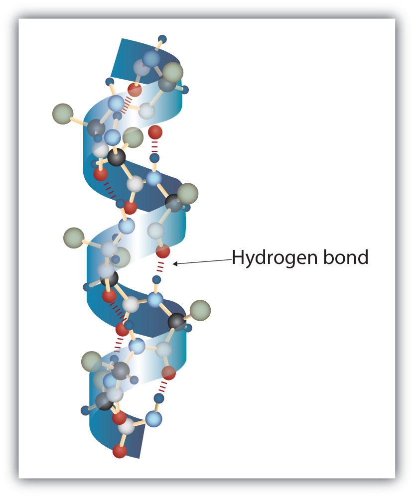 A protein molecule is not a random tangle of polypeptide chains. Instead, the chains are arranged in unique but specific conformations. The term secondary structureThe fixed arrangement of the polypeptide backbone. refers to the fixed arrangement of the polypeptide backbone. On the basis of X ray studies, Linus Pauling and Robert Corey postulated that certain proteins or portions of proteins twist into a spiral or a helix. This helix is stabilized by intrachain hydrogen bonding between the carbonyl oxygen atom of one amino acid and the amide hydrogen atom four amino acids up the chain (located on the next turn of the helix) and is known as a right-handed α-helix. X ray data indicate that this helix makes one turn for every 3.6 amino acids, and the side chains of these amino acids project outward from the coiled backbone (Figure 18.3 "A Ball-and-Stick Model of an α-Helix"). The α-keratins, found in hair and wool, are exclusively α-helical in conformation. Some proteins, such as gamma globulin, chymotrypsin, and cytochrome c, have little or no helical structure. Others, such as hemoglobin and myoglobin, are helical in certain regions but not in others.