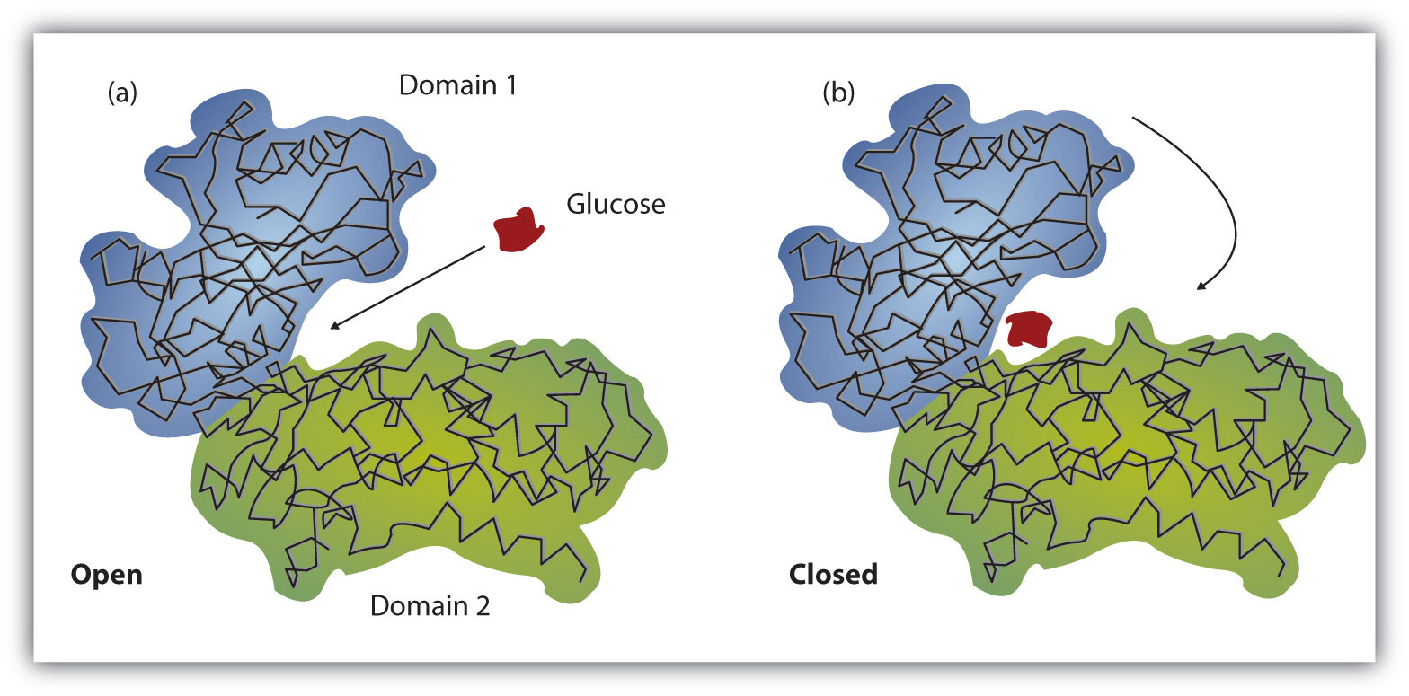 (a) The enzyme hexokinase without its substrate (glucose, shown in red) is bound to the active site. (b) The enzyme conformation changes dramatically when the substrate binds to it, resulting in additional interactions between hexokinase and glucose.