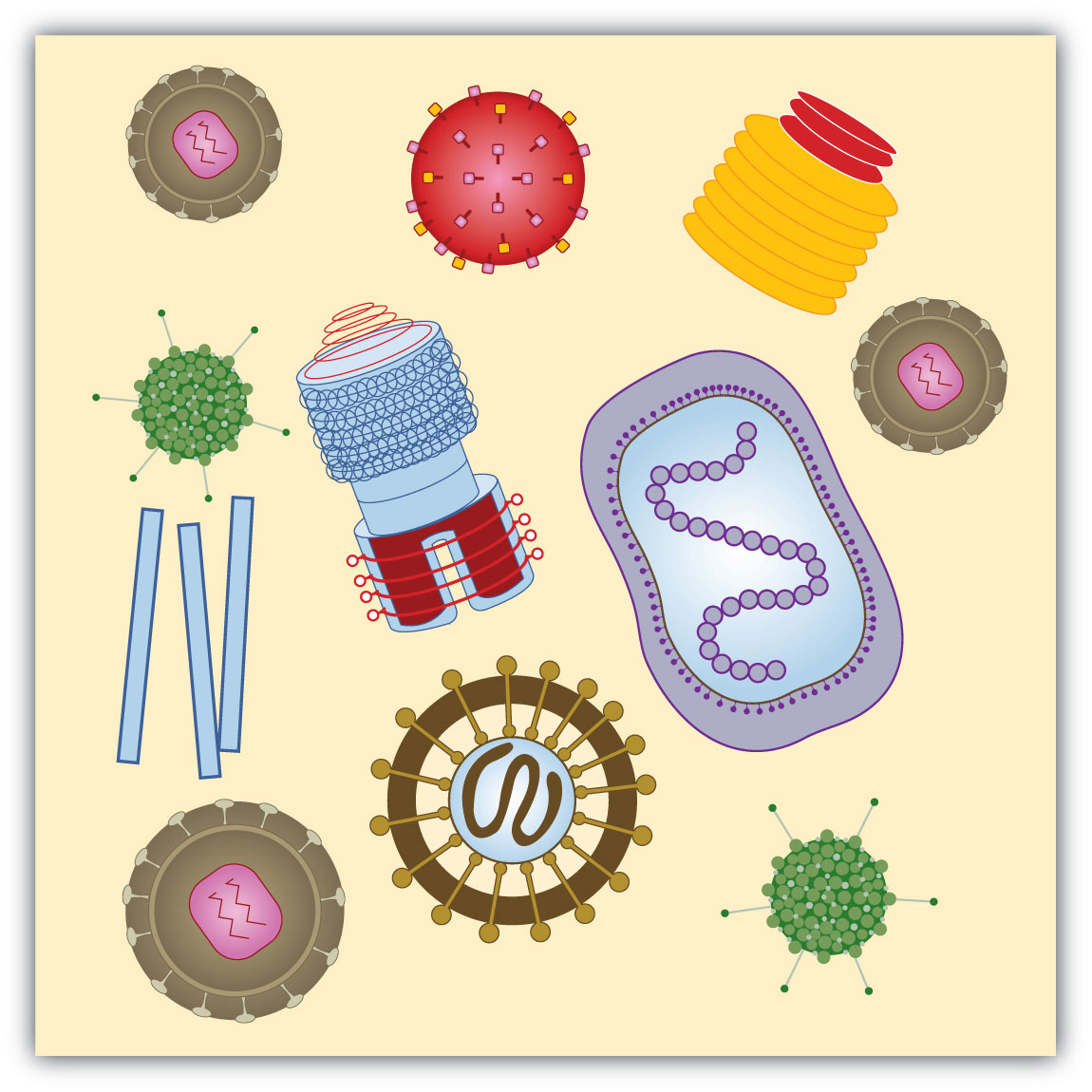 Infectious diseases caused by viruses include the common cold, influenza, and acquired immunodeficiency syndrome (AIDS) and are among the most significant health problems in our society. VirusesAn infectious agent that is much smaller and simpler than bacteria. are infectious agents far smaller and simpler than bacteria that are composed of a tightly packed central core of nucleic acids enclosed in a protective shell. The shell consists of layers of one or more proteins and may also have lipid or carbohydrate molecules on the surface. Because of their simplicity, viruses must invade the cells of other organisms to be able to reproduce.