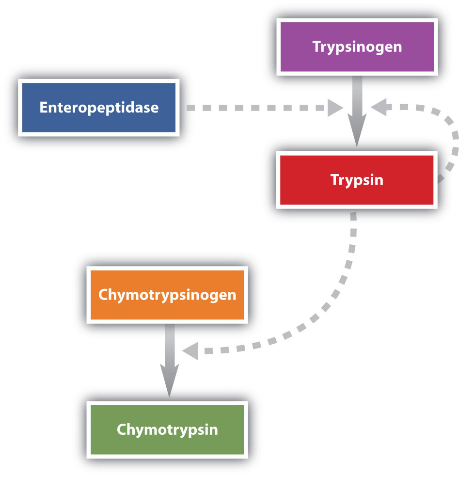 Protein digestion is completed in the small intestine. Pancreatic juice, carried from the pancreas via the pancreatic duct, contains inactive enzymes such as trypsinogen and chymotrypsinogen. They are activated in the small intestine as follows (Figure 20.7 "Activation of Some Pancreatic Enzymes in the Small Intestine"): The intestinal mucosal cells secrete the proteolytic enzyme enteropeptidase, which converts trypsinogen to trypsin; trypsin then activates chymotrypsinogen to chymotrypsin (and also completes the activation of trypsinogen). Both of these active enzymes catalyze the hydrolysis of peptide bonds in protein chains. Chymotrypsin preferentially attacks peptide bonds involving the carboxyl groups of the aromatic amino acids (phenylalanine, tryptophan, and tyrosine). Trypsin attacks peptide bonds involving the carboxyl groups of the basic amino acids (lysine and arginine). Pancreatic juice also contains procarboxypeptidase, which is cleaved by trypsin to carboxypeptidase. The latter is an enzyme that catalyzes the hydrolysis of peptide linkages at the free carboxyl end of the peptide chain, resulting in the stepwise liberation of free amino acids from the carboxyl end of the polypeptide.