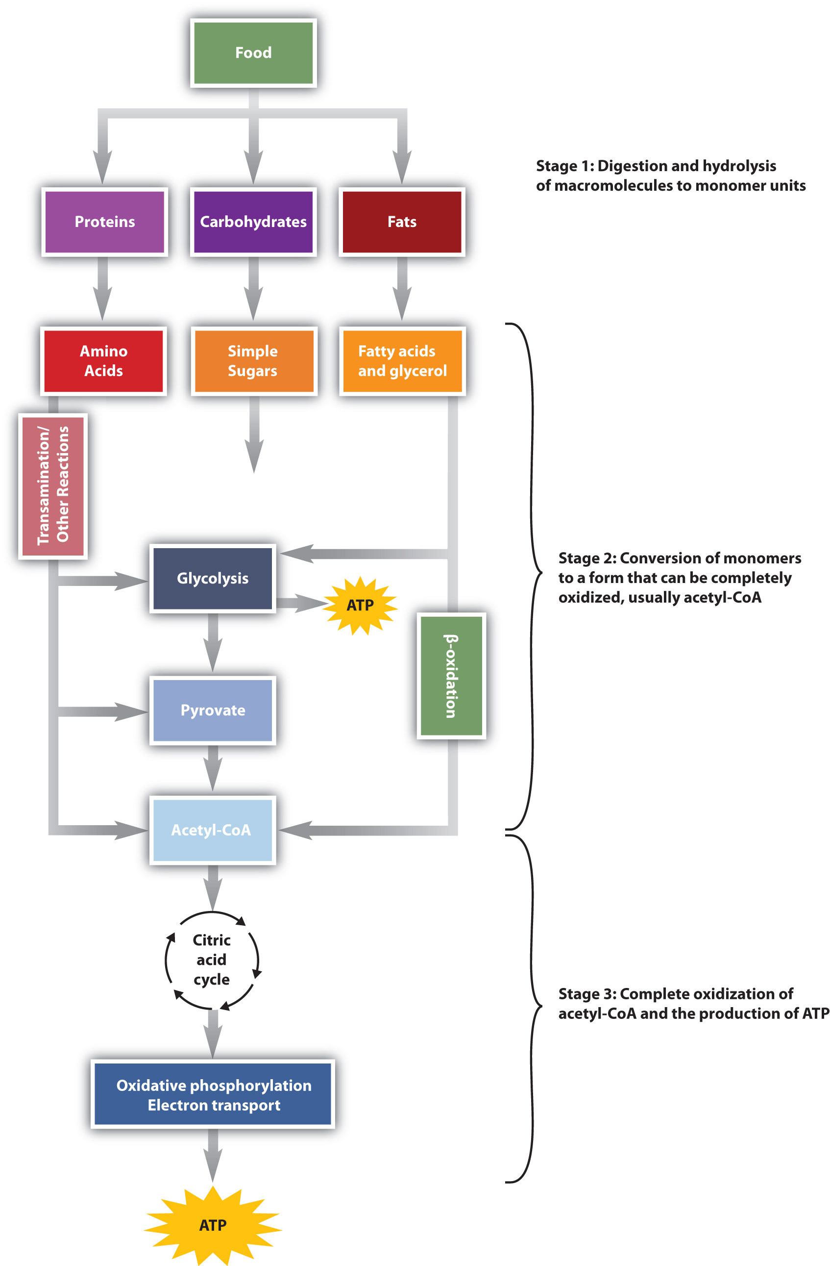 The conversion of food into cellular energy (as ATP) occurs in three stages.