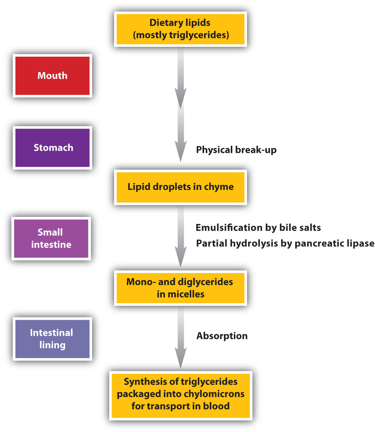 Lipid digestion begins in the upper portion of the small intestine (Figure 20.9 "The Principal Events and Sites of Lipid (Primarily Triglyceride) Digestion"). A hormone secreted in this region stimulates the gallbladder to discharge bile into the duodenum. The principal constituents of bile are the bile salts, which emulsify large, water-insoluble lipid droplets, disrupting some of the hydrophobic interactions holding the lipid molecules together and suspending the resulting smaller globules (micelles) in the aqueous digestive medium. (For more information on bile salts, see Chapter 17 "Lipids", Section 17.4 "Steroids".) These changes greatly increase the surface area of the lipid particles, allowing for more intimate contact with the lipases and thus rapid digestion of the fats. Another hormone promotes the secretion of pancreatic juice, which contains these enzymes.