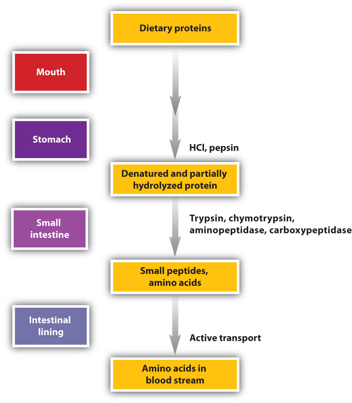 Aminopeptidases in the intestinal juice remove amino acids from the N-terminal end of peptides and proteins possessing a free amino group. Figure 20.8 "Hydrolysis of a Peptide by Several Peptidases" illustrates the specificity of these protein-digesting enzymes. The amino acids that are released by protein digestion are absorbed across the intestinal wall into the circulatory system, where they can be used for protein synthesis.
