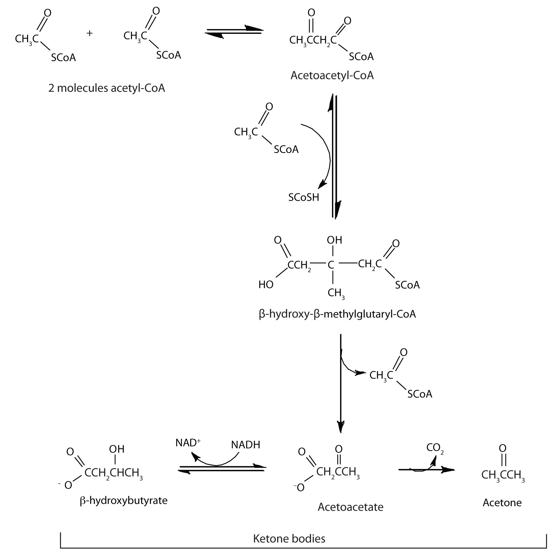 In the liver, most of the acetyl-CoA obtained from fatty acid oxidation is oxidized by the citric acid cycle. However, some of the acetyl-CoA is used to synthesize a group of compounds known as ketone bodies: acetoacetate, β-hydroxybutyrate, and acetone. Two acetyl-CoA molecules combine, in a reversal of the final step of β-oxidation, to produce acetoacetyl-CoA. The acetoacetyl-CoA reacts with another molecule of acetyl-CoA and water to form β-hydroxy-β-methylglutaryl-CoA, which is then cleaved to acetoacetate and acetyl-CoA. Most of the acetoacetate is reduced to β-hydroxybutyrate, while a small amount is decarboxylated to carbon dioxide and acetone.