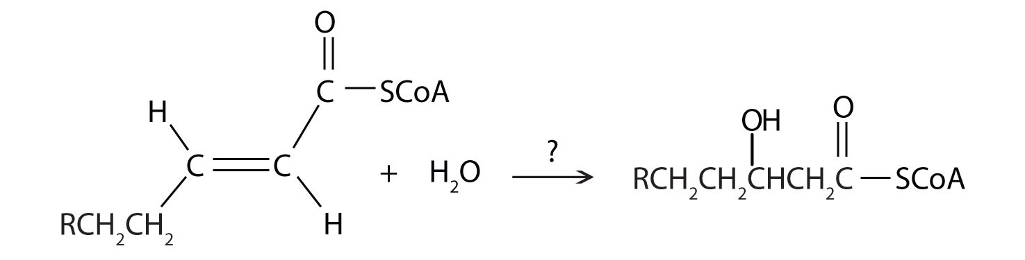 Next, the trans-alkene is hydrated to form a secondary alcohol in a reaction catalyzed by enoyl-CoA hydratase. The enzyme forms only the L-isomer.