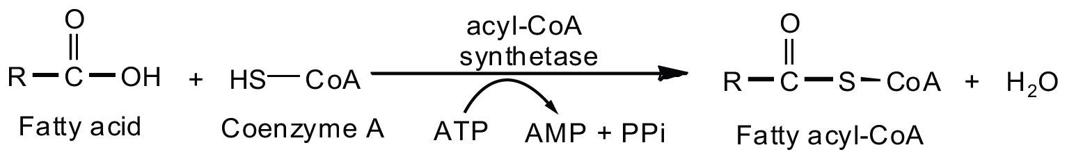 Fatty acid oxidation is initiated on the outer mitochondrial membrane. There the fatty acids, which like carbohydrates are relatively inert, must first be activated by conversion to an energy-rich fatty acid derivative of coenzyme A called fatty acyl-coenzyme A (CoA). The activation is catalyzed by acyl-CoA synthetase. For each molecule of fatty acid activated, one molecule of coenzyme A and one molecule of adenosine triphosphate (ATP) are used, equaling a net utilization of the two high-energy bonds in one ATP molecule (which is therefore converted to adenosine monophosphate [AMP] rather than adenosine diphosphate [ADP]):