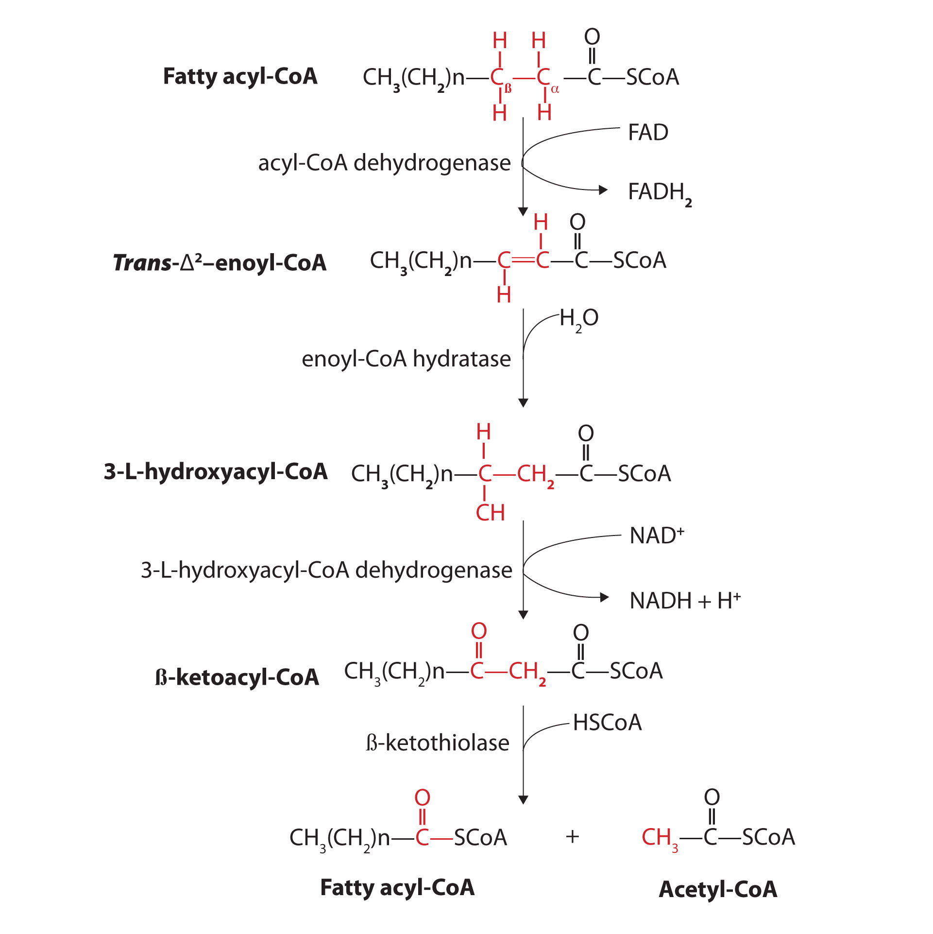 Further oxidation of the fatty acyl-CoA occurs in the mitochondrial matrix via a sequence of four reactions known collectively as β-oxidationA sequence of four reactions in which fatty acyl-CoA molecules are oxidized, leading to the removal of acetyl-CoA molecules. because the β-carbon undergoes successive oxidations in the progressive removal of two carbon atoms from the carboxyl end of the fatty acyl-CoA (Figure 20.18 "Fatty Acid Oxidation").